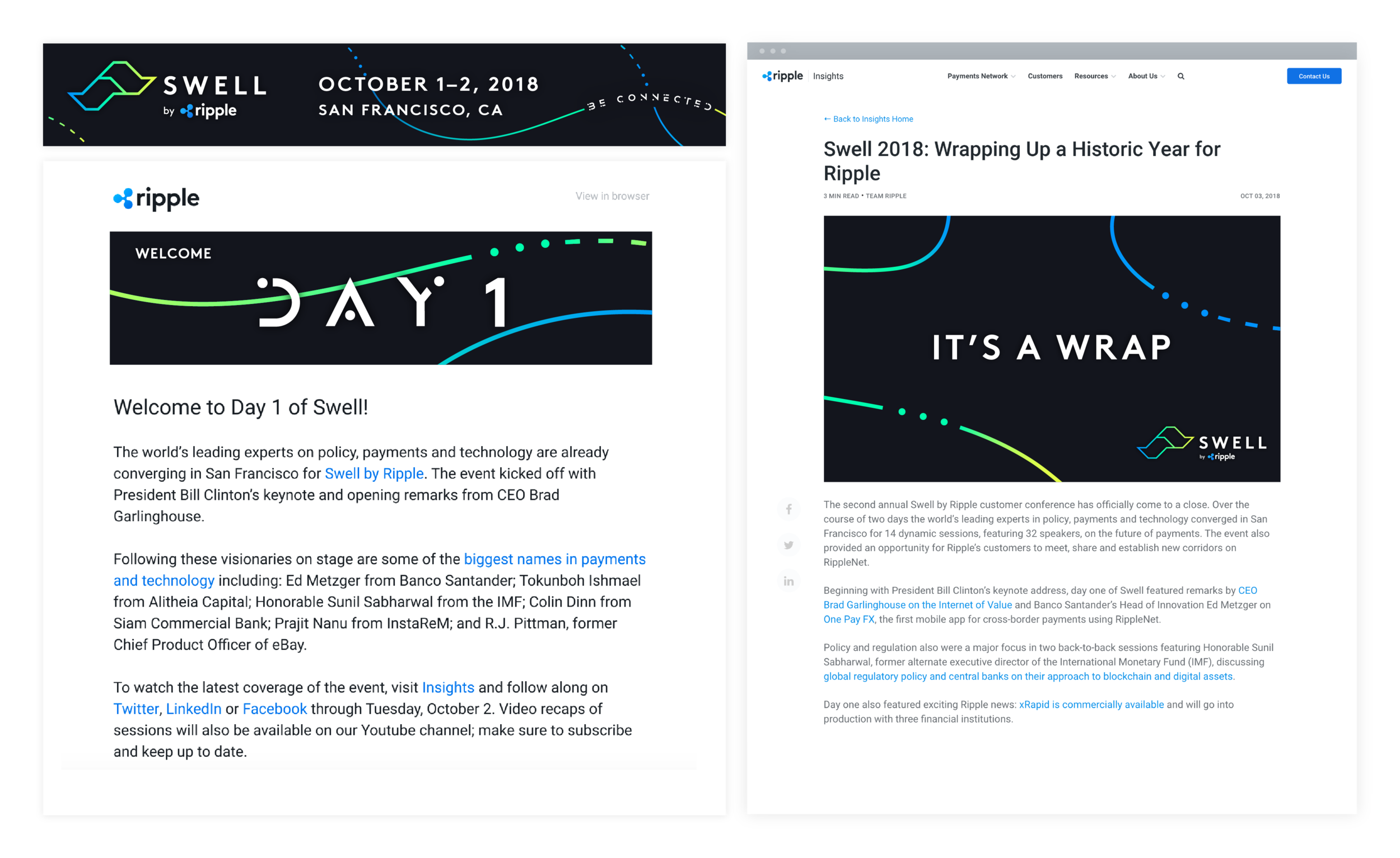 Swell, hosted by Ripple, is an annual event that brings together the world’s leading experts on blockchain, policy, payments and technology. The main focus of the second annual Swell by Ripple conference was to provide an opportunity for Ripple’s customers to meet, share and establish new corridors on RippleNet.